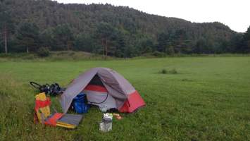 I made it to the ferry in time for the 21:00 h sailing. Since there aren't any campsites in the area I needed to improvise. The small road leading west looked appealing so I went there to find a pitch. Some of the more obvious spots near the water were already taken by car campers so I ventured ever further until I spotted what looked like a meadow behind some trees. It's most certainly farm land but from the looks of it it hasn't seen any tractor action in days, so I decided to go for it.
